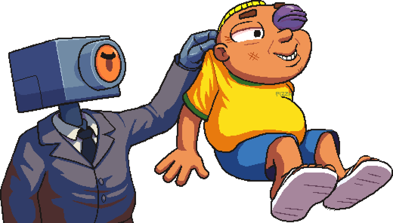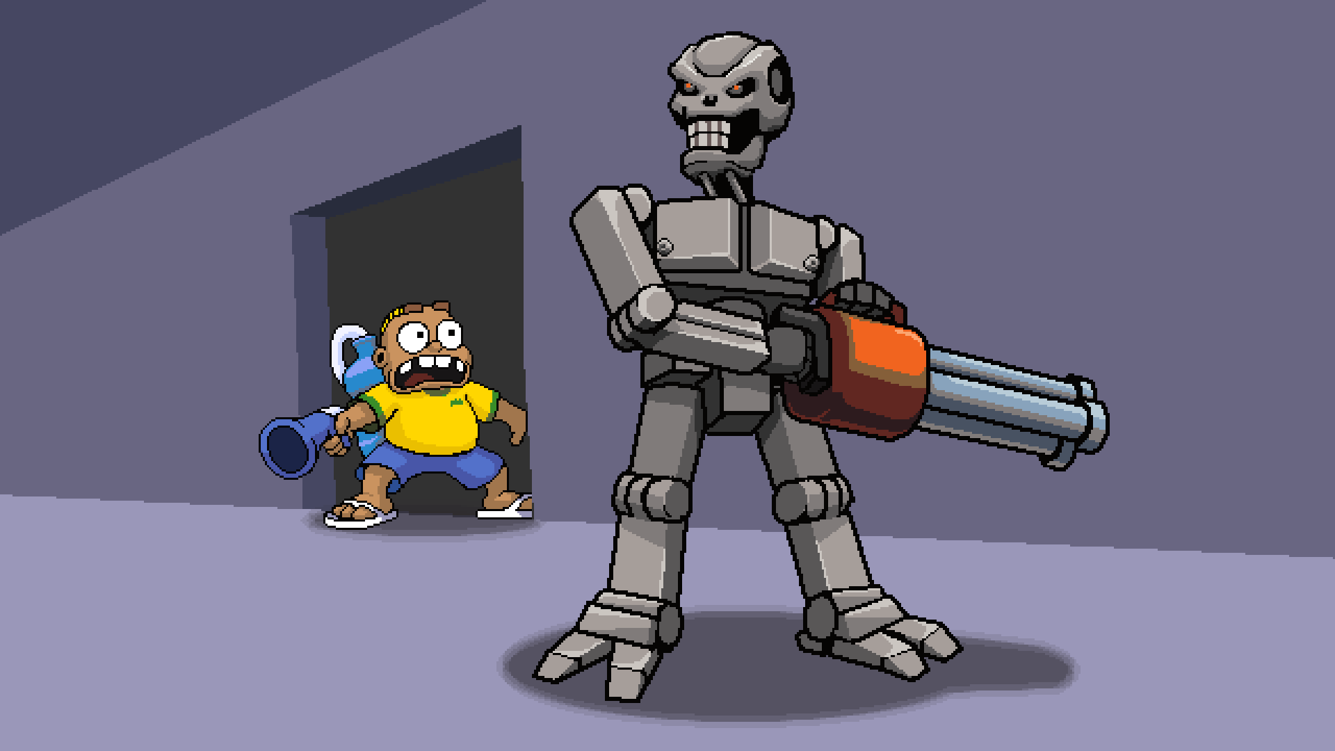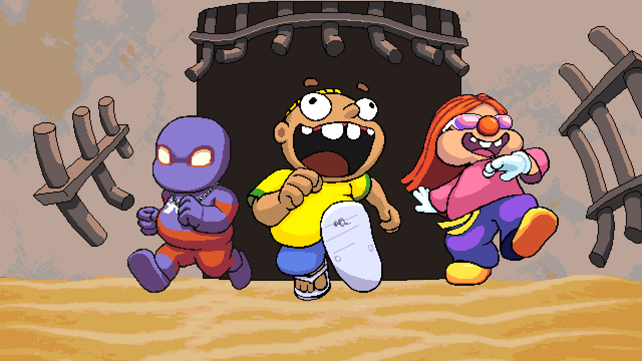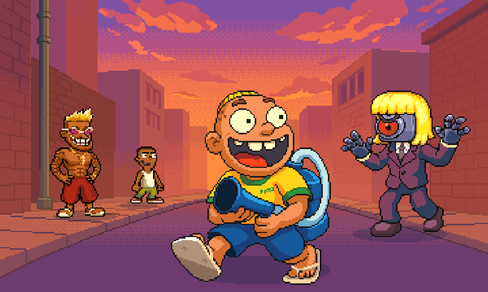 Zueirama 2 mistura várias mecânicas em uma experiência única e divertida. Você alterna entre entregar pizzas de moto dando aquele wheelie maroto, explorar fases de plataforma cheias de segredos e enfrentar hordas de robôs em um modo roguelike usando o poderoso Esguicho. Cada parte tem seu ritmo próprio, mas tudo se conecta de forma natural e cheia de humor.